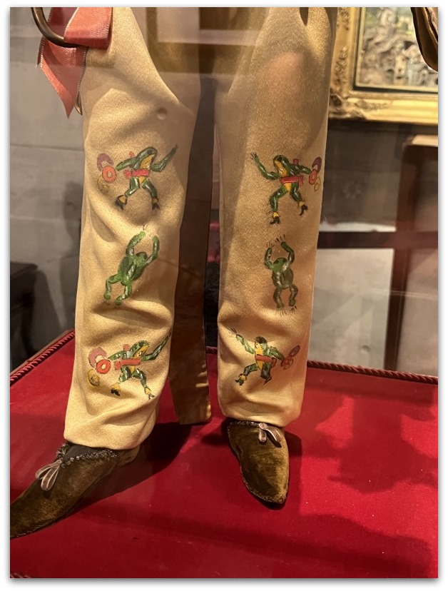 傘と扇を操る道化師 ギュスターブ・ヴィシー(1900)ズボンに鳥獣戯画をモチーフとした絵柄が用いられています。